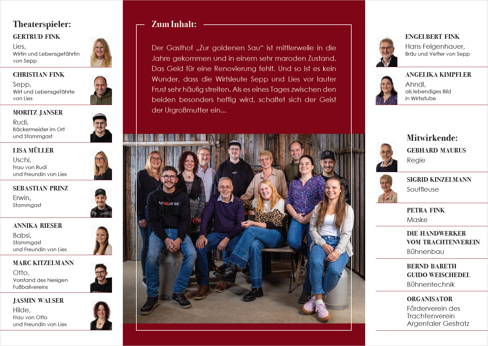 Der Gasthof „Zur goldenen Sau“ ist mittlerweile in die Jahre gekommen und in einem sehr maroden Zustand. Das Geld für eine Renovierung fehlt. Und so ist es kein Wunder, dass die Wirtsleute Sepp und Lies vor lauter Frust sehr häufig streiten. Als es eines Tages zwischen den beiden besonders heftig wird, schaltet sich der Geist der Urgroßmutter ein...
